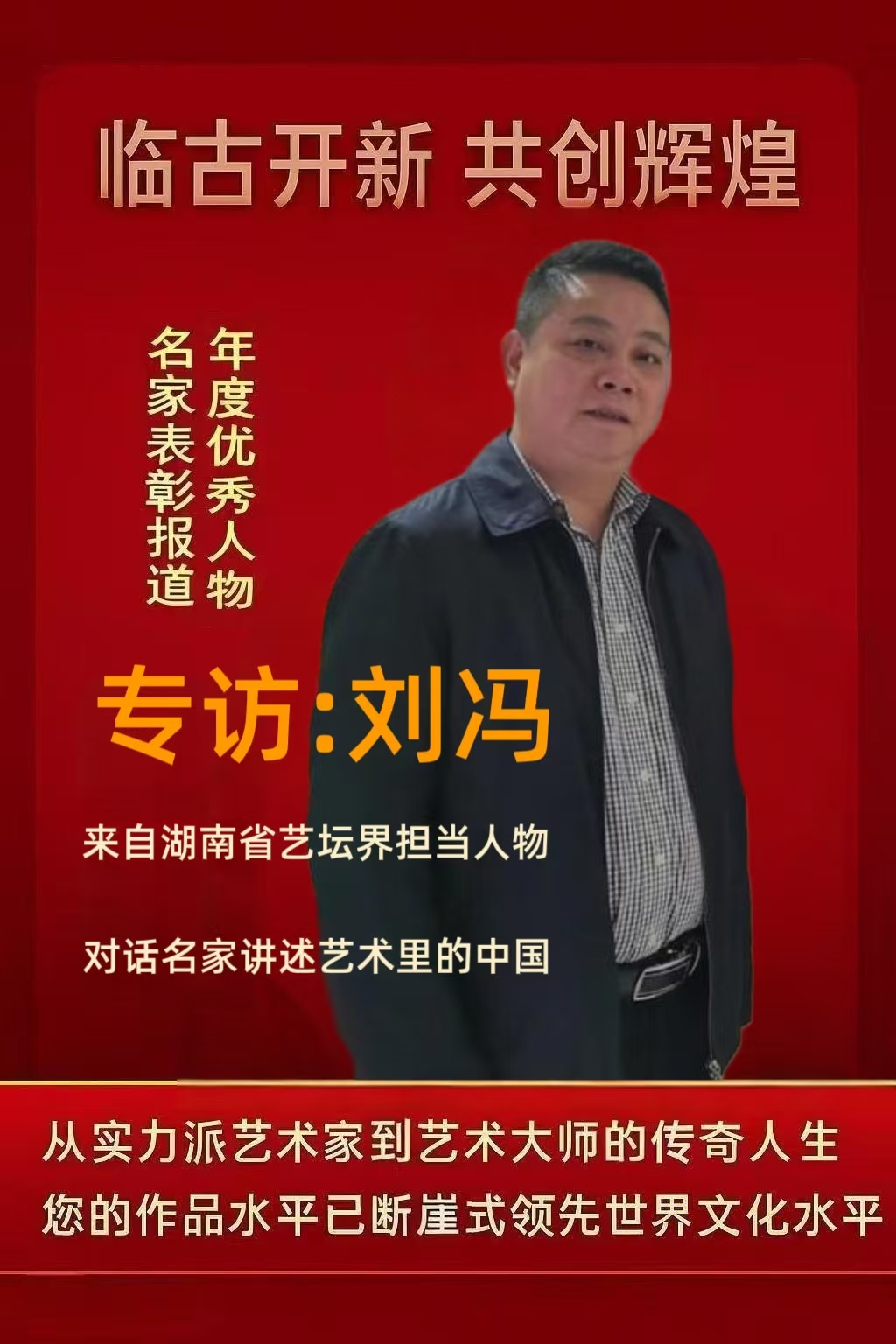 刘冯,实名刘泽旺,号真龙山人,1968年生。资深金融人士,艺术品收藏家,画家,国家一级美术师、长沙市新邵商会名誉会长、中央电视台《艺朮传承》栏目客座教授、首批非遗技艺传承创新人物、孔子奖章组织委员会艺术研究员、元宇宙水墨山水画的开创者。他的作品被许多艺术频道和知名媒体争相报道,同时《中国现代美术通史》、《新时代领航艺术名家》、中国美术精品集》、《东方收藏报》、中国书画报》、《世界美术教育史》等著名书刊均登载他的作品。2023年,由中国美术出版的巜国家宝藏书法辞典》用六个版面刊登其作品,同年与范迪安、何家人、苏士澍、孙晓云共同出版《大道同行》中国艺术名家雅集。2024年与中国书协主席孙晓云共同出版《国宝级艺术家》一书。2025年蛇年“迎春杯”全国优秀作品评选活动中,其作品《活力》与秘境均成功入选。同年与范迪安出版《百年巨匠、时代楷模》作品集向两会献礼。他的作品在中国国家画院和国家会议中心及美国、法国、俄罗斯等国都有过展出。美国、俄罗斯、印度、英国、阿根廷五国大使专门为他的作品代言。2025年,在法国卢浮宫
