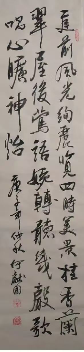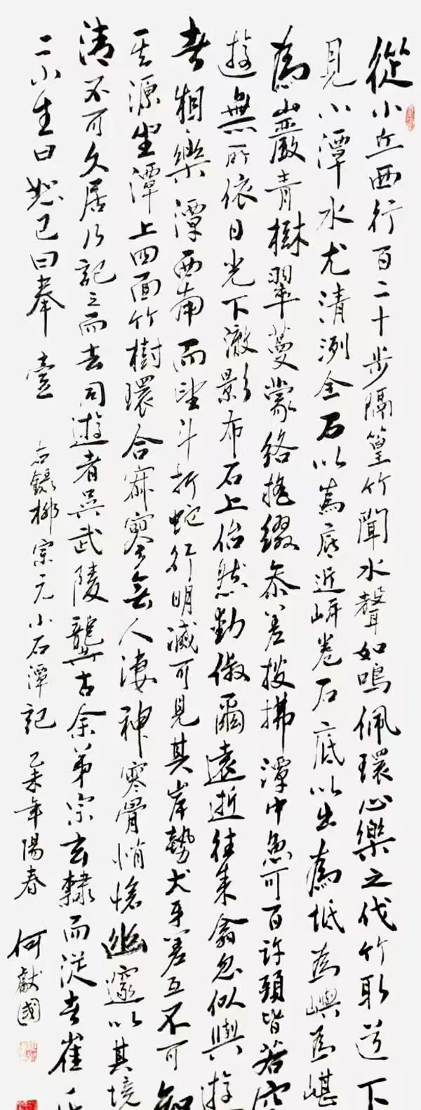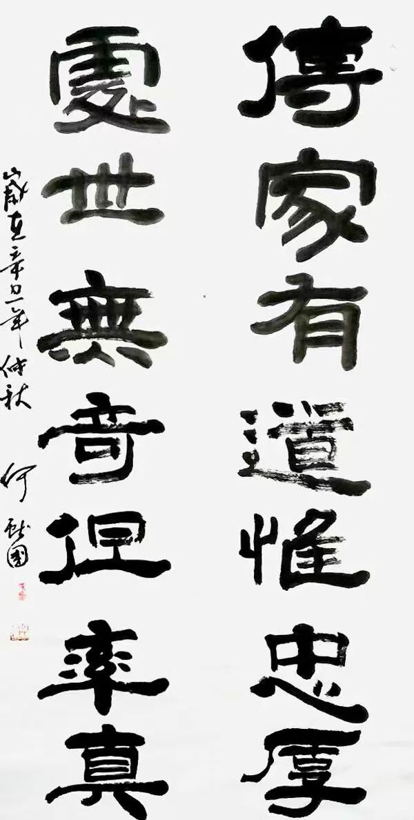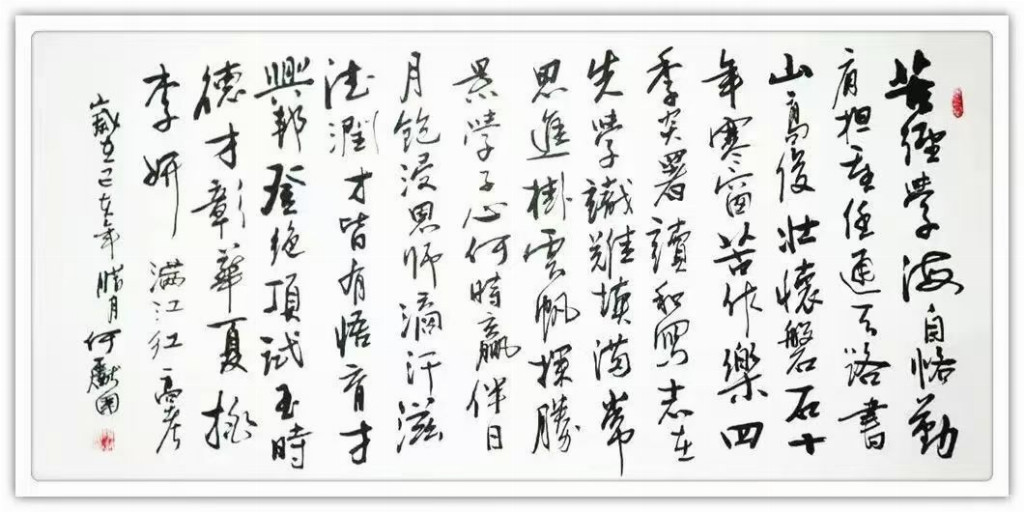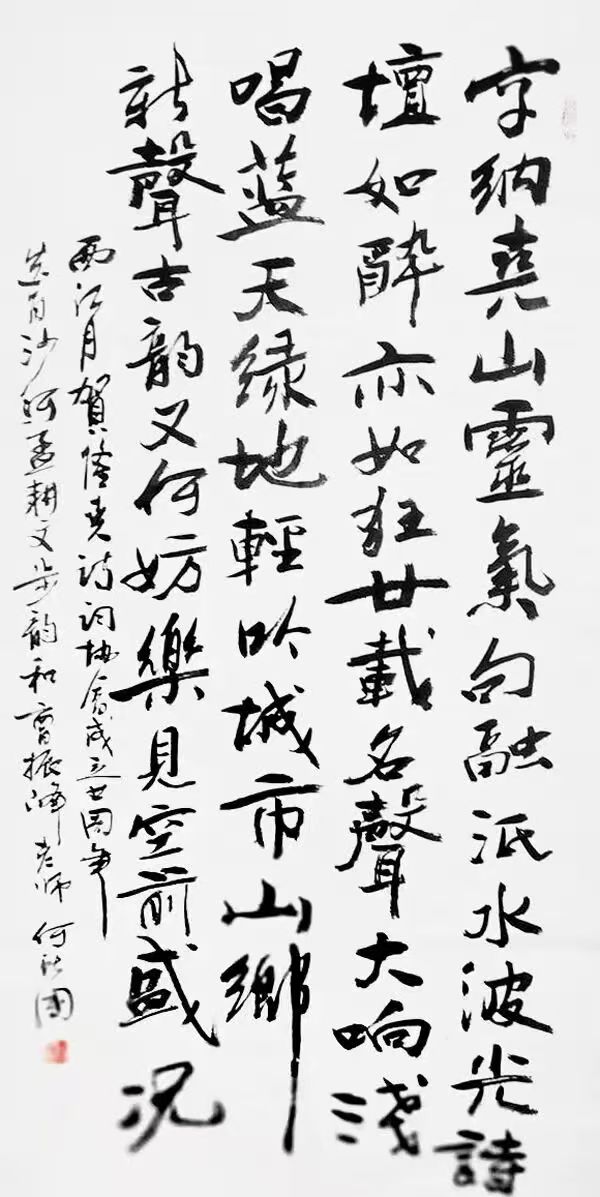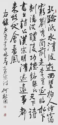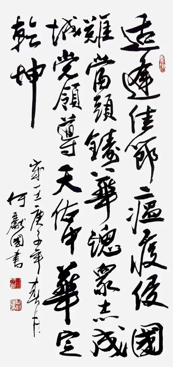 何献国,以刚柔并济、清新飘逸、忠雅醇厚为核心风格,主攻行草、隶书,兼擅多体,融传统与创新。